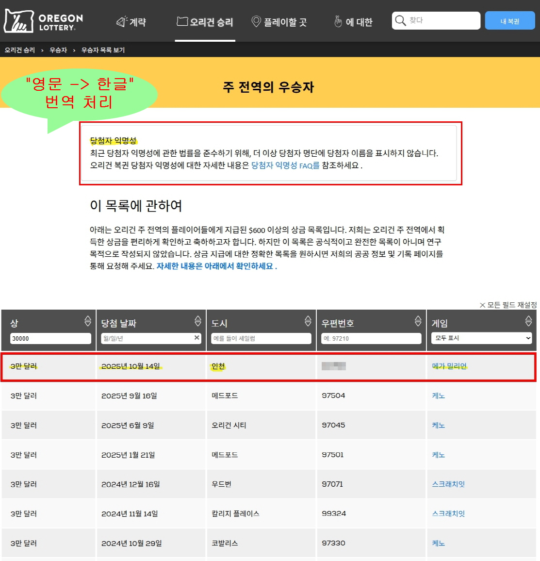 "오리건주 복권 당첨자의 익명성에 대한 규칙이 최근에 변경되어 당첨자 이름 표기X"