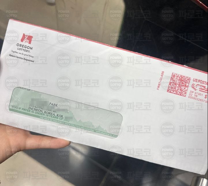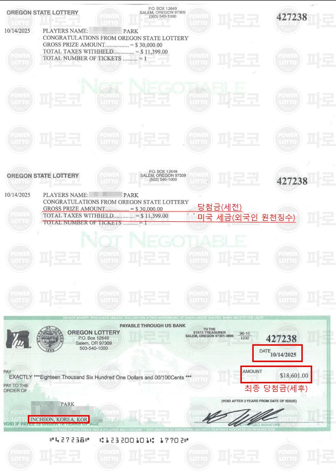 [당첨금 지급 내역 - 오리건 복권국 발급 수표]